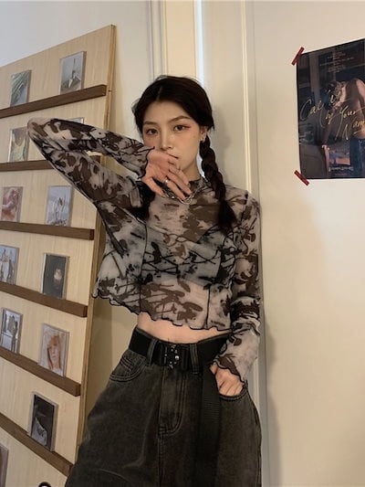 2024 春夏 女度を格上げ tシャツ ファッション トップス 薄手 韓国系 長袖 薄手フィット プリント レイヤード 重ね着 肌見せ 女っぽハイフレンチタイト丈 レディース T