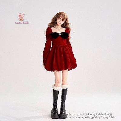 サンタ コスプレ秋冬の新作脚魅せミニスカート冬のフレンチレトロなリボンベルベットスカート上品でおしゃれな高級感のあるワンピースポンポンのつぼみスカート