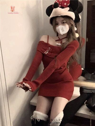 サンタ コスプレ秋冬の新作ワンショルダーセーターワンピース女性秋冬修身セクシーデコルテクリスマスレッドヒップニットスカート