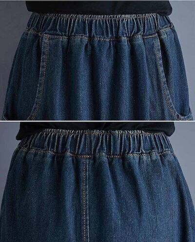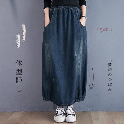 デニムスカート レディース ロング丈 ランタンスカート マキシ丈スカート ユーズド加工 無地 バルーン 美脚 ウェストゴム付き カジュアル おしゃれ 体型カバー 秋 冬 20代 30代