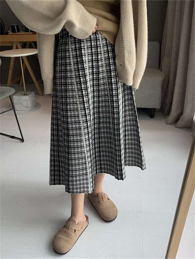 スカート ハイウエスト 秋冬 ニット チェック レディース ロング Aラインスカート ボトムス マキシスカート カジュアル 着痩せ お洒落 きれいめ 着回し 体型カバー 厚手 暖か 防寒 ウエストゴム