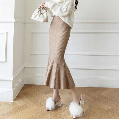 スカート レディース マーメイドスカート ボトムス タイトスカート リブニット 無地 春 秋 冬 伸縮性 ウエストゴム リブニットスカート フレア ハイウエスト ミモレスカート 美スタイル シンプル