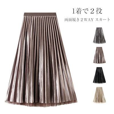 スカート プリーツスカート レディース 無地 リバーシブル ベロア プリーツ ロング チュールスカート ボトムス チュール 春 秋 冬 レトロ ハイウエスト エレガント 体型カバー 着痩せ 通勤 OL