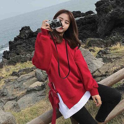 レディース パーカー プルオーバー フード付き スリット オーバーサイズ ゆったり 大きめ トレーナー 長袖 トップス カジュアル 可愛い りぼん おしゃれ レッド ブラック イエロー ブルー