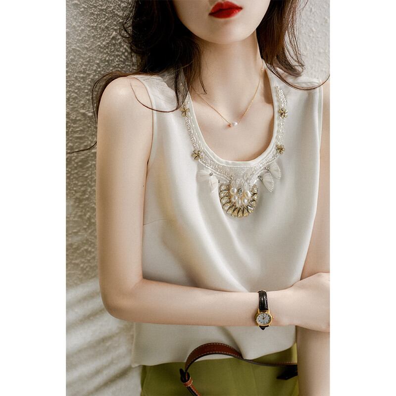 初回送料無料レディーストップスノースリーブスクエアネックビーズ飾りゆったりシャツ